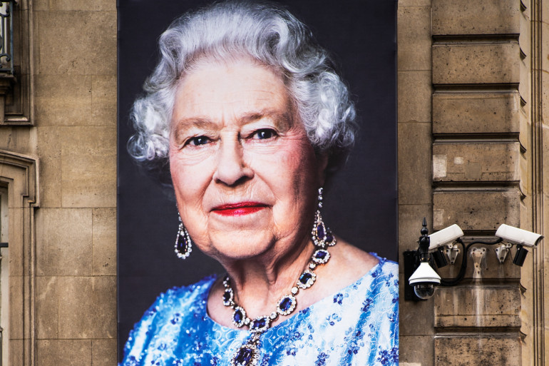 巴黎英国大使馆前的英女王伊利沙伯二世(Queen Elizabeth II)图像,2022年